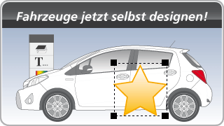 - Karosserieteil oder komplettes Auto gestalten (Folienauswahl, Beschriftung, Logo & Bild Upload)